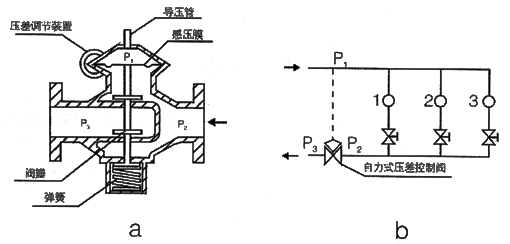 ?。?)對(duì)于具有多個(gè)支路的環(huán)路,裝設(shè)ZY47型自力式壓差控制閥,可以達(dá)到兩個(gè)目的:a、吸收外網(wǎng)的壓力波動(dòng),使被控環(huán)路的水力工況不受外網(wǎng)壓力波動(dòng)的影響。b、削弱各支路間的調(diào)節(jié)干擾(即一個(gè)支路的調(diào)節(jié)對(duì)其它支路的流量所產(chǎn)生的影響)。對(duì)于第a條是顯而易見的;對(duì)于第b條,這里與裝設(shè)手動(dòng)調(diào)節(jié)閥作一個(gè)對(duì)比分析。